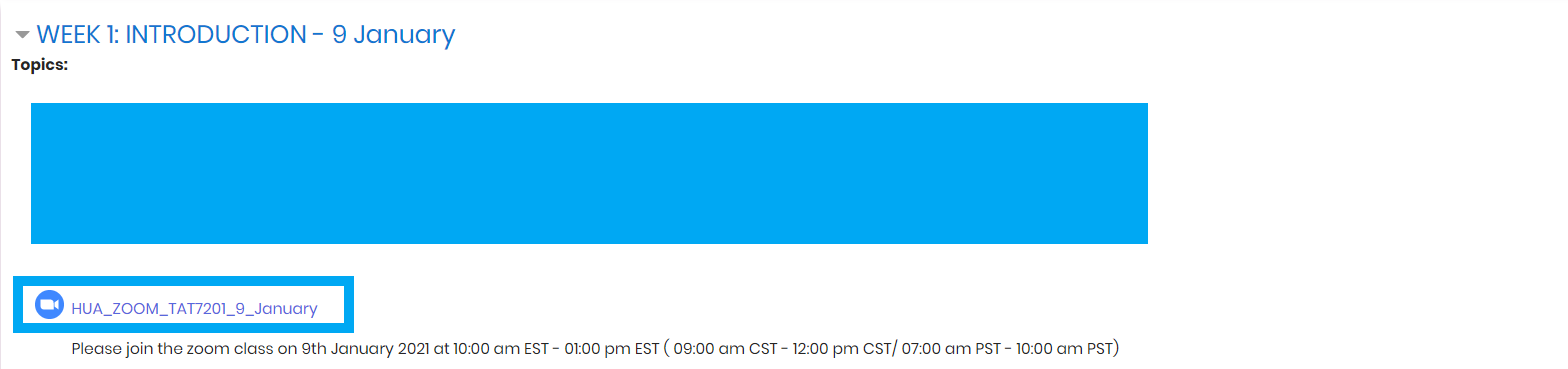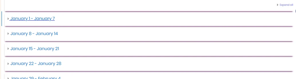 4) To view the contents in the week, click on the triangle to the left of the week. This will expand the contents in the week. Your zoom meeting link will be visible under each week.